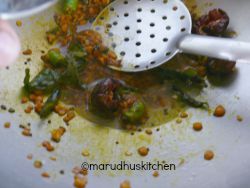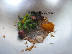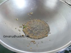 2.Keep a kadai add oil  mustard,urad and bengal gram dhal to hot oil and when seeds splutter,dhals become brown add both chillies,hing and curry leaves.