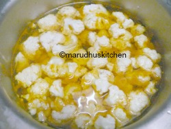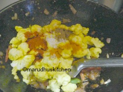 8.Add the florets with turmeric,chilli powder,garam masala and salt needed for the gravy.