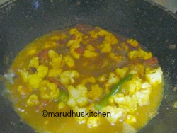 - Add the florets with turmeric,chilli powder,garam masala and salt needed for the gravy.