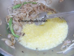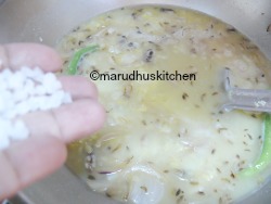 6.When it changes colour add green chillies and onions and cook for some time with some salt so that onions cooks fast.