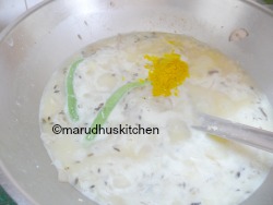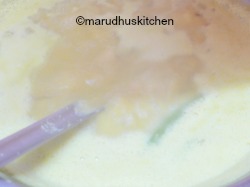 9.Add turmeric powder and boil.Now after some time add ground paste and at this stage again check for salt and if less add.