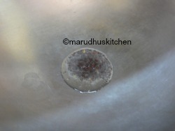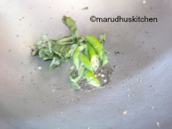 3.When oil is hot add kadugu and when it crackles add green chillies and some curry leaves.