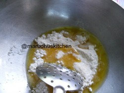 - Add ghee after it heats up add rava,maida mixture.