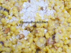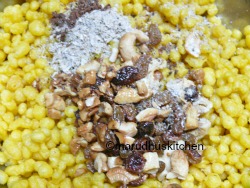 15.In between add fried cashew grape mixture ,cardamom powder to the fried boondi.