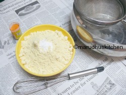 4.Take besan with a pinch of soda and sieve it add colour and add water to mix without lumps to a paste first.