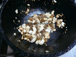 - Then fry cashews in little ghee then add dry grapes till golden keep aside.