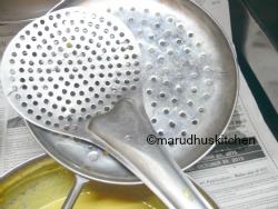 3.Keep two perforated ladles ready one for shaving off the batter and another for straining away boondi.