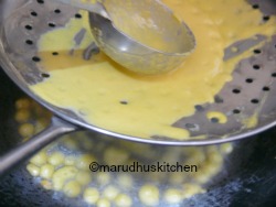 - Keep two perforated ladles ready one for shaving off the batter and another for straining away boondi.