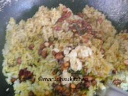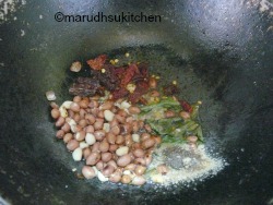 - Add both dals,peanuts,curry leaves,red chilles and asafoetida.