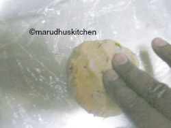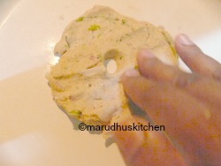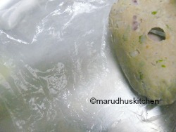 3.Then heat a dosa pan take little balls and pat the dough to circular shapes by wetting the hands in water now and then or you can use a polythene sheet to pat the dough and then transfer it to hot pan(like shown above).