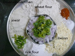 included!usually each home has its own variations here.For Bhajini mixture too the flour combinations vary but with no compromise in taste.Its really kind of powerful breakfast that fills your stomach that you can be free without any craving for food for long hours.Its served hot with a simple curd or a pickle and that’s the simplicity of this recipe filled with all the nutritional goodness.I have not used ragi flour if you want you can add with this four flour mixture making it five,sure will be delicious.Even urad dhal is roasted and made into flour to make aromatic thalipeeths.