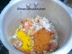 - When seeds splutter add onions and tomatoes and stir for sometime till tomatoes are tender.