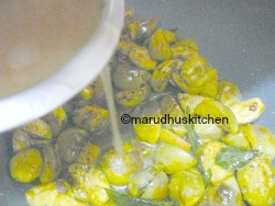 - when color of brinjal changes add tamarind water close lid and cook brinjals.