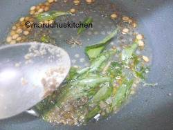 2.Keep a kadai with oil add mustard,uraddal and bengal gram dal and let mustard splutter and when dal changes colour add curry leaves with asafoetida.