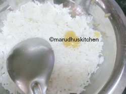 7.In-between spread the cooked rice in a large bowl by adding ghee to it.