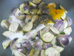 - Then add brinjals with salt and turmeric powder,saute nicely.