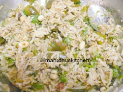 10.Add vangi bath paste,peanuts and chopped coriander to rice and mix well.