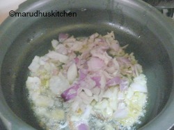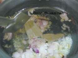 4.Then add chopped onions cook till golden ,add bay leaf also.
