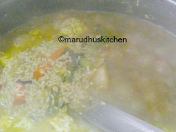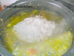 12.Add rice stir in and let it boil till water absorbs rice half way(when some water left).