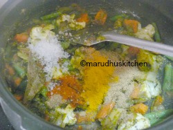 8.After stirring the veggies nicely add turmeric,salt,chilli and coriander powders.