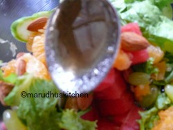 As I have already mentioned in my earlier posts!this scorching summer urges me to make and try different types of salads and it’s always super freshening to have it.There is no exact strict measurements that you should follow while adding combo of fruits!you can change according to your own need.If you want your lettuce to be crunchy soak it in ice cold water for some time before adding it to the salad.I have used country cucumber that is locally available here but you can use normal cucumbers that are available in your area.