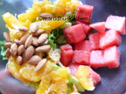 - Cut a water melon,make segments with oranges,slice cucumbers and tear some lettuce leaves.